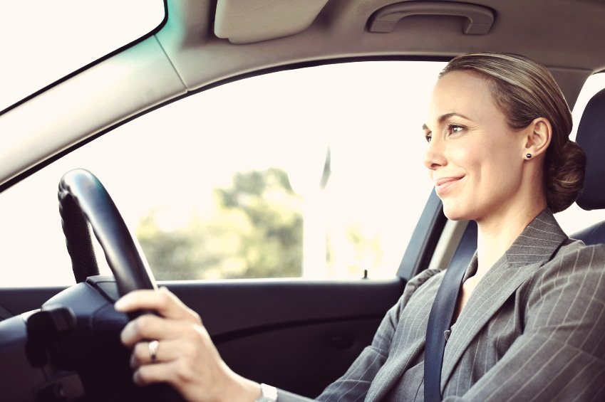 Beautiful female professional smiling while driving car. Horizontal shot.